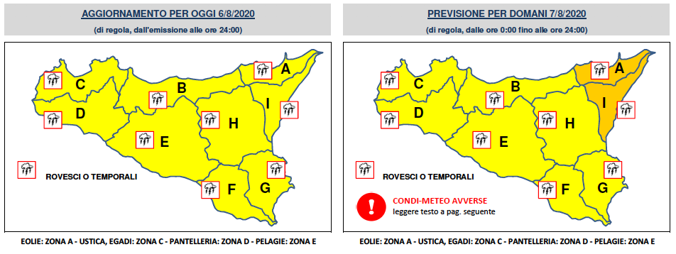Allerta meteo. La Protezione Civile Regionale ha diffuso un avviso per il rischio meteo-idrogeologico e idraulico, valido da ora fino alle 24.00 di domani. Per la giornata di oggi il livello di allerta è di colore giallo (“ATTENZIONE “) con precipitazioni da isolate a sparse, a prevalente carattere di rovescio o temporale, con quantitativi cumulati deboli o puntualmente moderati. Per la giornata di domani, venerdì 7 agosto, il livello di allerta su tutta la Sicilia è di colore arancione (“PREALLARME”).