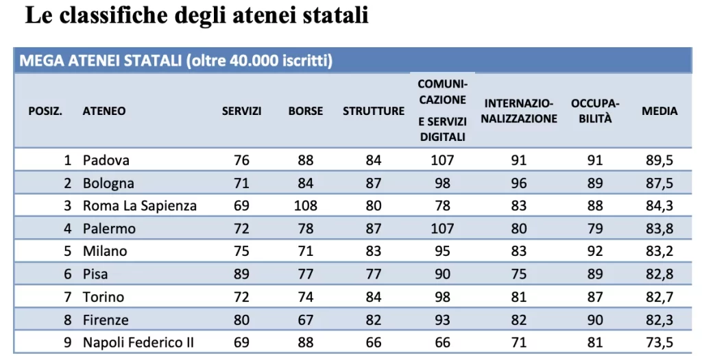 La classifica dei mega atenei statali vede primeggiare l’Università di Padova con un punteggio di 89,5, seguita dall’Università di Bologna (87,5) e dalla Sapienza di Roma (84,3). L’Università di Palermo, con il suo recente avanzamento al quarto posto, si posiziona appena sotto questo podio, dimostrando un miglioramento significativo nelle sue performance accademiche e infrastrutturali.