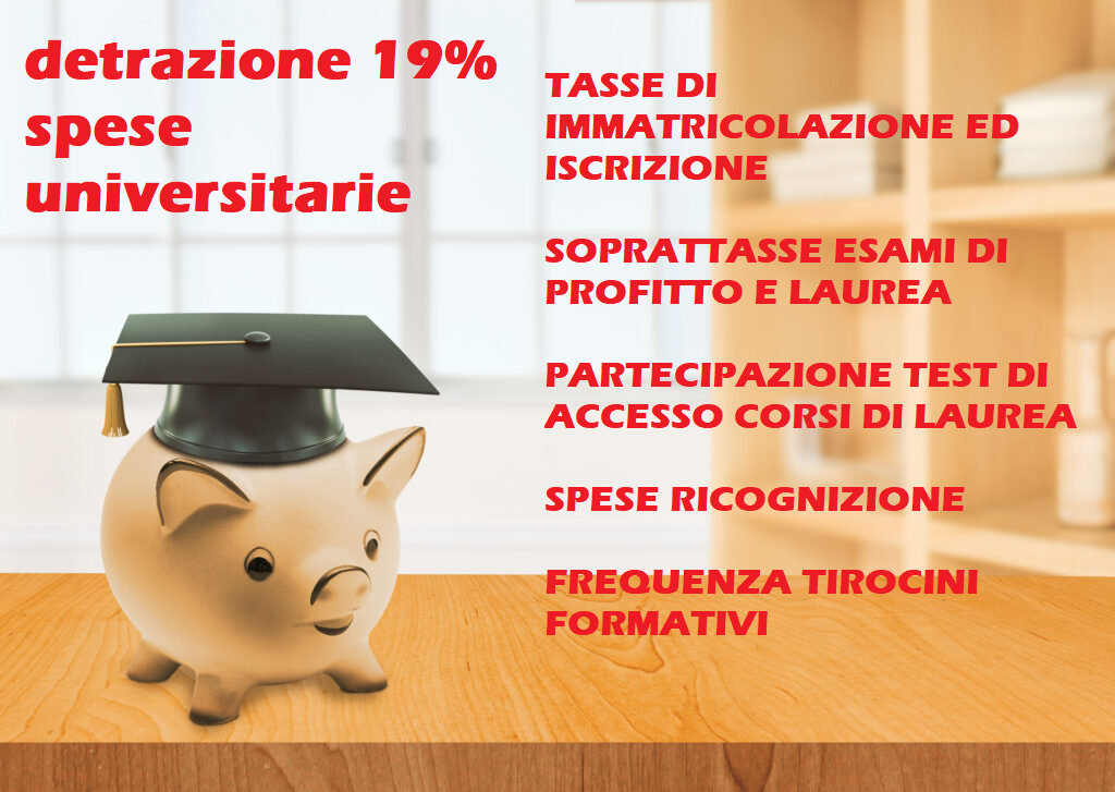 - Sono detraibili le tasse di immatricolazione ed iscrizione, soprattasse per esami di profitto e laurea, la partecipazione ai test di accesso ai corsi di laurea, ricongiunzione di carriera, iscrizione all’appello di laurea e rilascio della pergamena, frequenza a corsi singoli, e altri costi specifici.