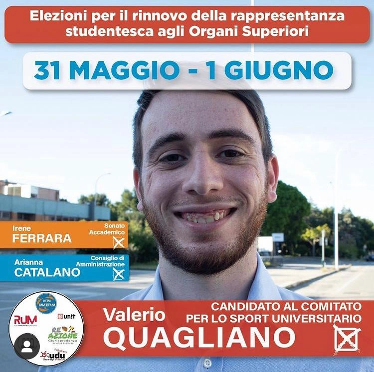 Per il CSU (Comitato Sportivo Universitario) il candidato dell’associazione UDU-Unione degli Universitari Valerio Quagliano, dichiara:
