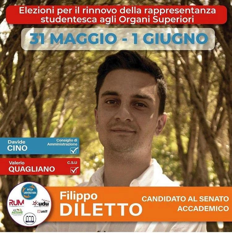 Per il Senato Accademico, il candidato dell’associazione RUM- Rete Universitaria Mediterranea, Filippo Diletto, dichiara: