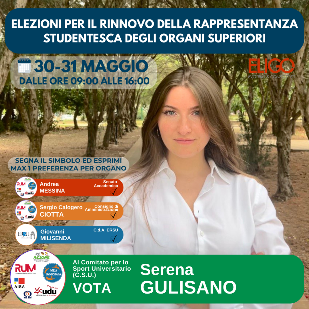 Per il CSU (Comitato Sportivo Universitario) la candidata dell’associazione Intesa Universitaria Serena Gulisano, dichiara: