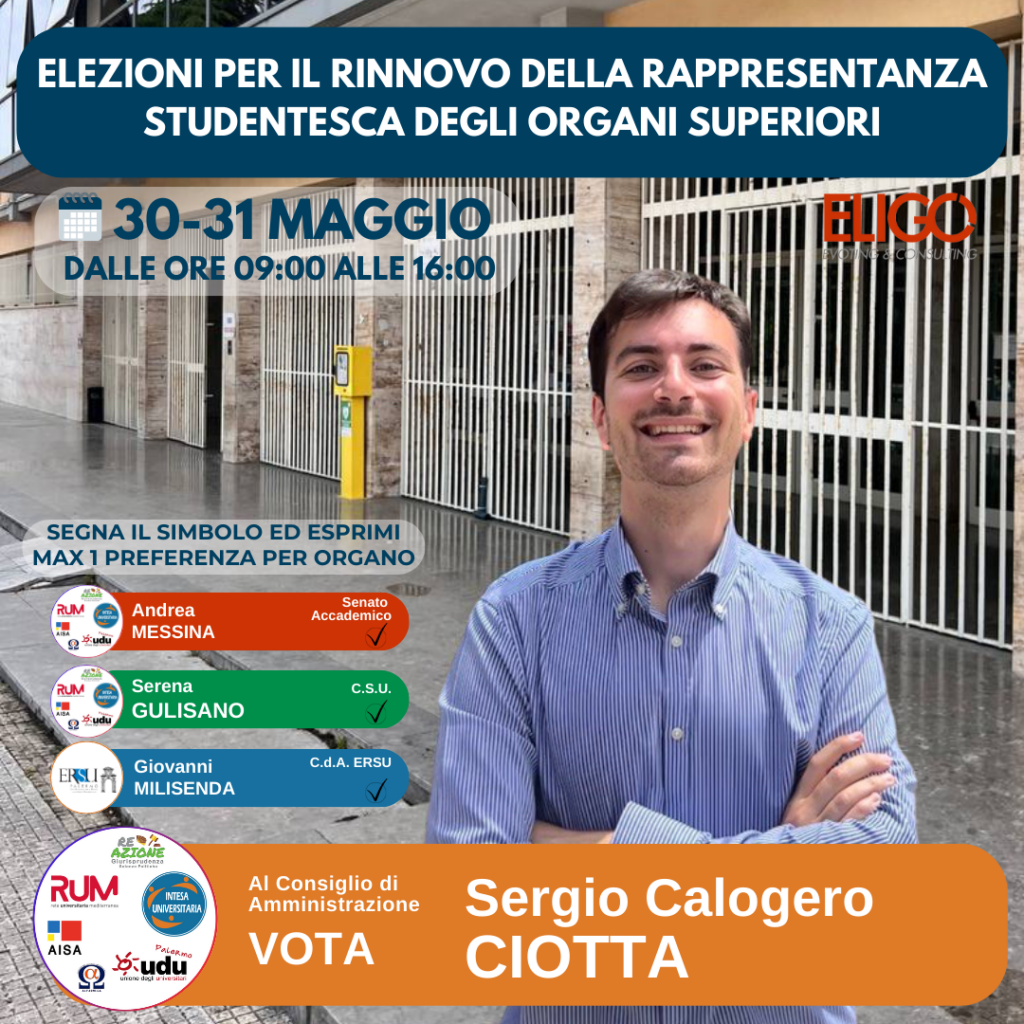 Per il Senato Accademico, il candidato dell’associazione RUM-Rete Universitaria Mediterranea, Andrea Messina, dichiara: