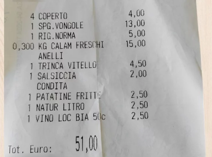 Dopo un pranzo in Sicilia a Catania, il cliente mostra lo scontrino, il costo del pranzo è veramente sorprendente.