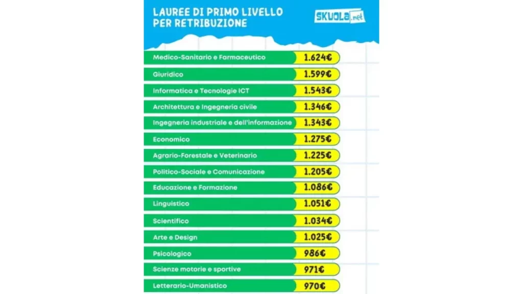 Oltre al tasso occupazionale, un altro parametro chiave è la retribuzione mensile. E anche su questo fronte le lauree tecnico-scientifiche e sanitarie fanno la differenza. In particolare, tra le triennali, l’area Medico-Sanitaria e Farmaceutica registra un tasso di collocamento dell’81,2%, con una media di due mesi per trovare lavoro e uno stipendio netto medio di 1.624 euro.