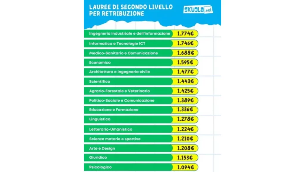 Tra i percorsi triennali più redditizi troviamo anche Ingegneria industriale (1.343 euro netti al mese) e Informatica ICT (1.543 euro). Tuttavia, in questi casi, le possibilità di assunzione dopo la sola triennale sono più basse: 30,1% per ingegneria e 59,5% per informatica. Proseguire con la magistrale, quindi, è spesso la chiave per sbloccare le migliori opportunità professionali.
