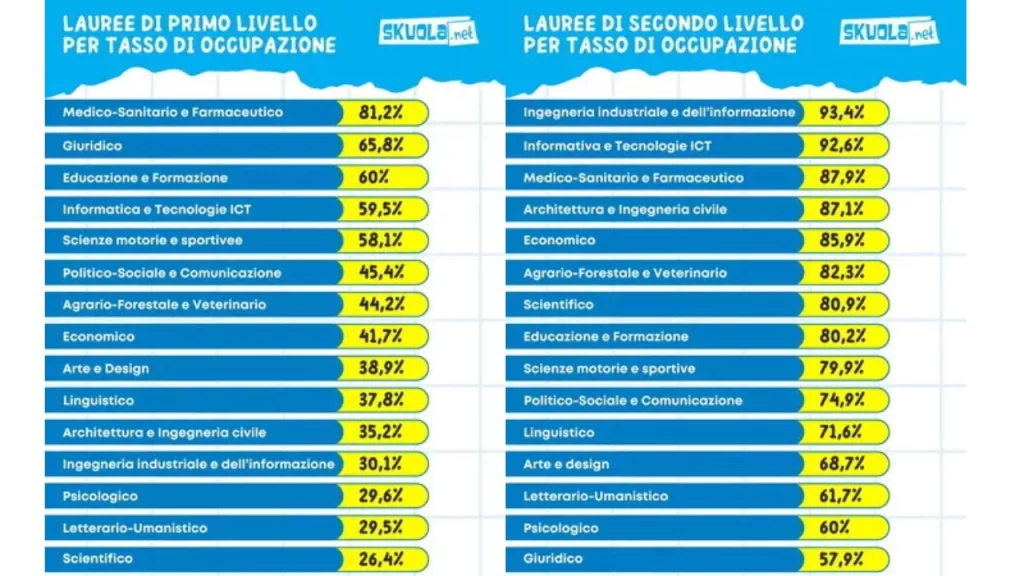 Secondo i dati analizzati da Skuola.net, il tasso di occupazione a un anno dal conseguimento del titolo ha raggiunto il 78,6% sia per i laureati triennali che magistrali. Un incremento netto rispetto all’anno precedente: +4,5% per il primo livello, +2,9% per il secondo. Un trend che rafforza l’idea che laurearsi oggi, specie in alcuni ambiti, può rappresentare un investimento concreto verso la stabilità lavorativa.