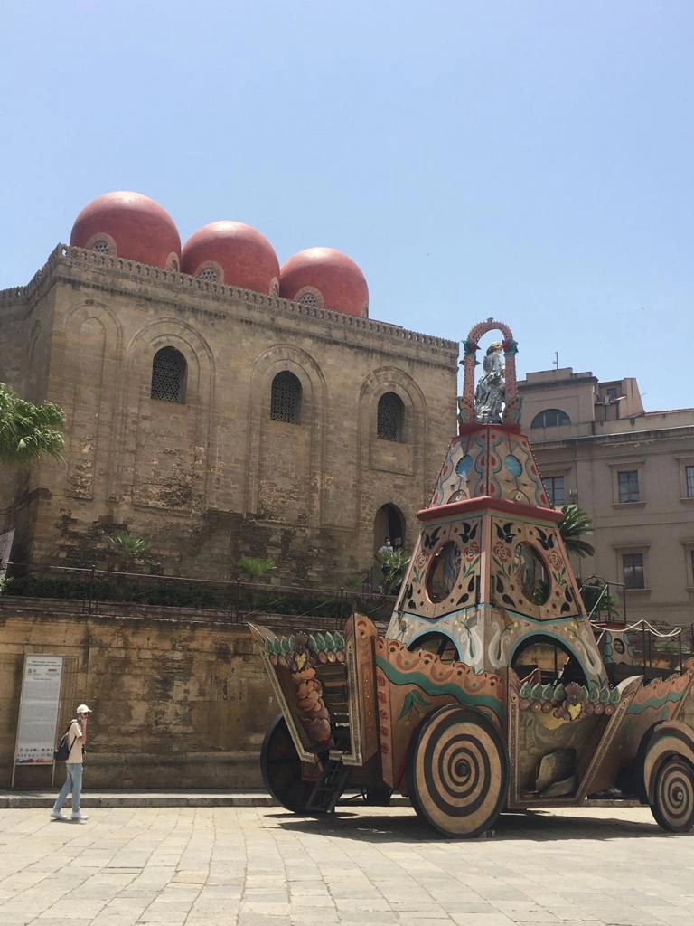 Il carro della Santuzza nel 2020 non ha fatto la sua classica sfilata del Cassaro. Dallo scorso anno però, è stato deciso di metterlo in bella mostra a Piazza Bellini, proprio dietro il Municipio, ai piedi della chiesa della Martorana. Così appare da circa un anno a turisti e palermitani che percorrono le vie del centro. Tutti si fermano ad ammirare e fare una foto ricordo. E del resto lo scenario merita