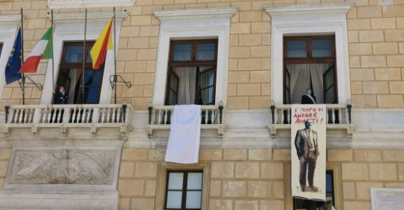 Palermo – Un grande lenzuolo bianco a Palazzo delle Aquile per ricordare Giovanni Falcone, Francesca Morvillo e gli agenti della scorta Vito Schifani, Rocco Dicillo e Antonio Montinaro nel 28° anniversario della Strage di Capaci