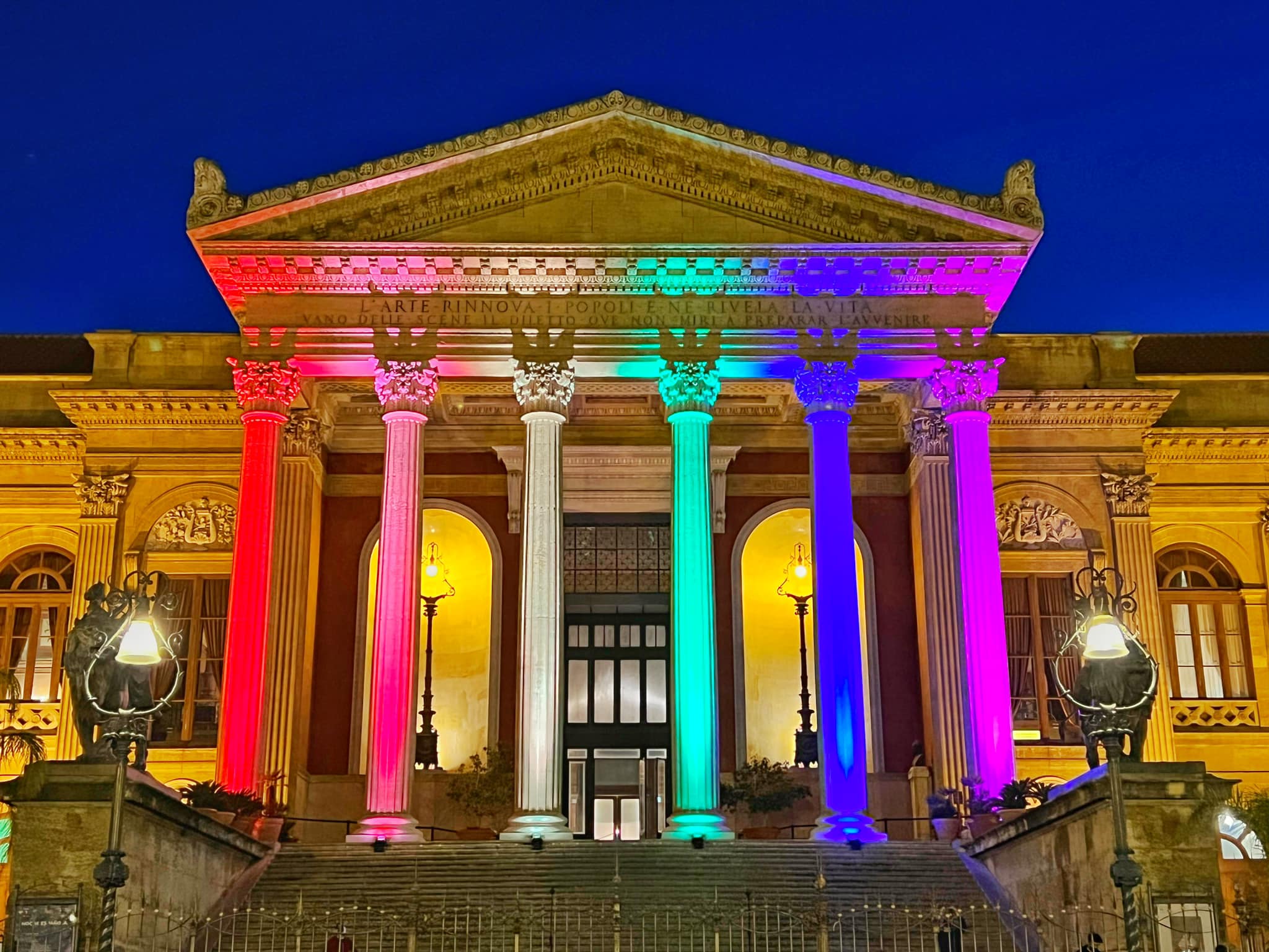 Il Teatro Massimo illuminato con i colori della bandiera della pace