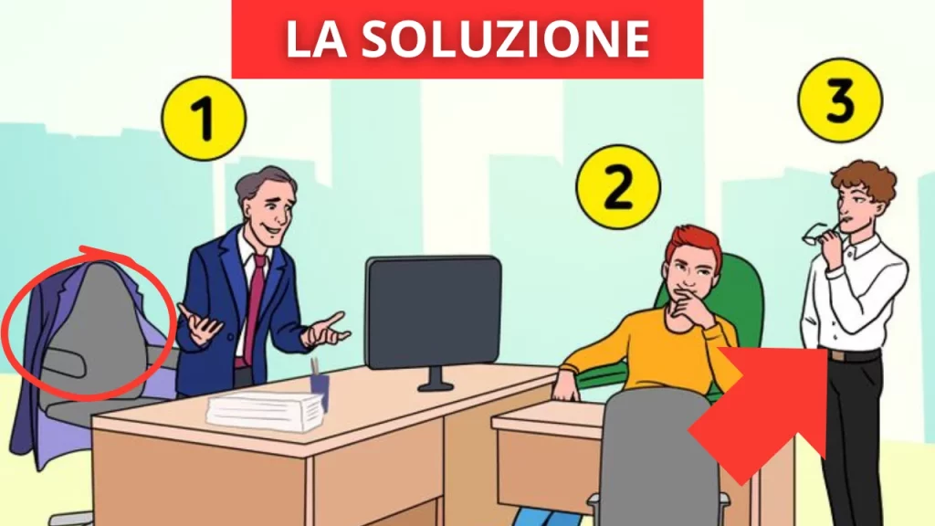 Il secondo uomo, vestito in modo informale, appare il meno adatto al ruolo di dirigente. Resta il terzo: è in piedi, indossa un abbigliamento formale senza giacca e viene osservato dagli altri due. I loro sguardi, l’atteggiamento e la disposizione degli elementi nella stanza portano tutti alla stessa conclusione: è lui il vero capo.