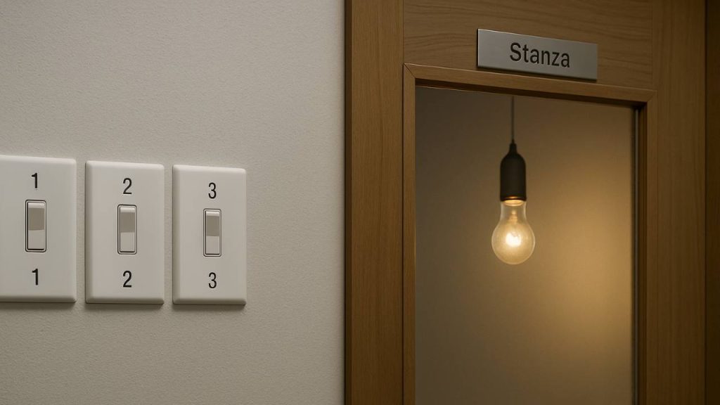 La regola è chiara: puoi azionare gli interruttori tutte le volte che vuoi, ma puoi aprire la porta solo una volta per controllare cosa succede dentro. L’obiettivo? Capire quale interruttore accende la lampadina.