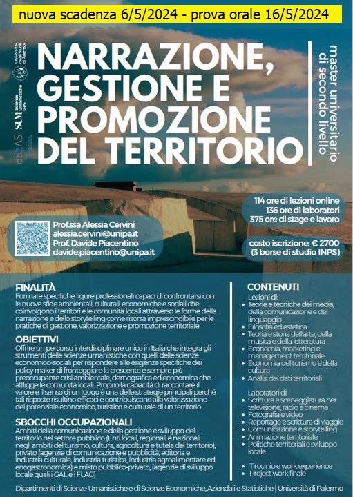 Il Master in “Narrazione, Gestione, e Promozione del Territorio” dell’Università degli Studi di Palermo ha l’obiettivo di formare professionisti in grado di confrontarsi di valorizzare il patrimonio materiale e immateriale e promuovere lo sviluppo locale di un territorio.