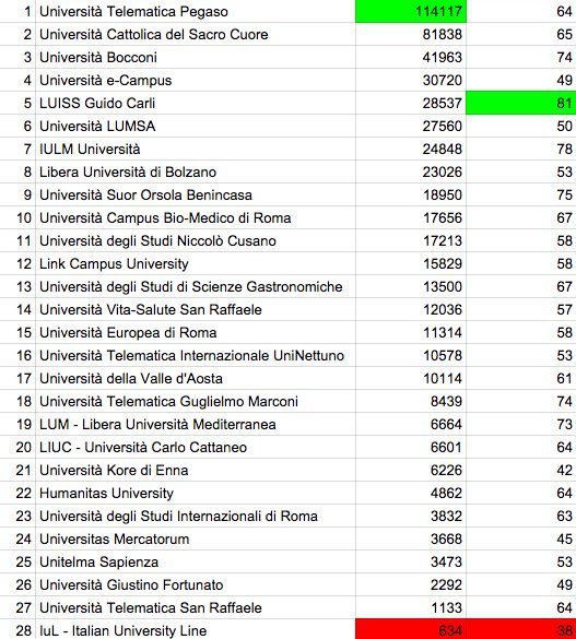 Prima di pubblicare la classifica, una premessa: abbiamo inserito le università non statali promosse da enti pubblici; quelle promosse da soggetti privati; quelle telematiche. Inoltre, siamo riusciti a individuare tutte queste su Facebook eccetto una: l’Università Telematica Leonardo Da Vinci di Torrevecchia Teatina. Nel caso in cui la pagina pubblica c’è, basta inviare una e-mail a [email protected].