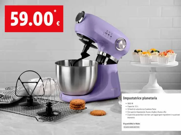L’articolo in questione è un’impastatrice planetaria, disponibile nei supermercati Lidl. Si distingue per il suo raffinato colore viola e la dotazione di accessori utili per affrontare anche le preparazioni più complesse, comprese quelle che prevedono impasti lievitati.