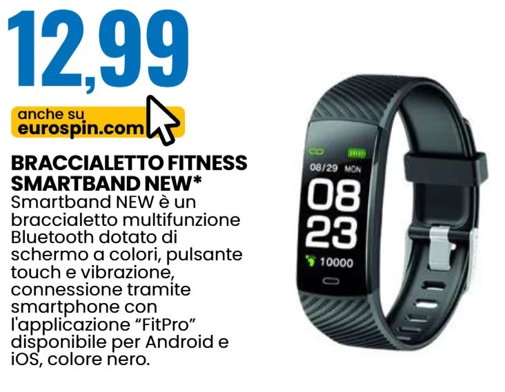 Fino al 29 giugno, hai la possibilità di acquistare lo Smartband NEW da Eurospin a un prezzo imbattibile. Un modo semplice, funzionale e conveniente per iniziare a muoverti di più, monitorare le tue giornate e regalarti un pizzico di tecnologia utile al benessere quotidiano.
